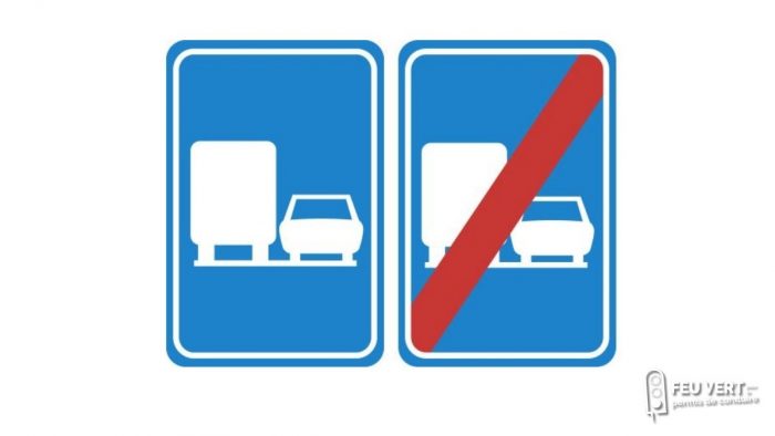 Autorisation (début et fin) de dépasser pour les conducteurs de véhicules et trains de véhicules affectés au transport de choses dont la masse maximale autorisée est supérieure à 3,5 tonnes par la gauche un véhicule attelé, un véhicule à moteur à deux roues ou un véhicule de plus de deux roues jusqu’au signal F109.